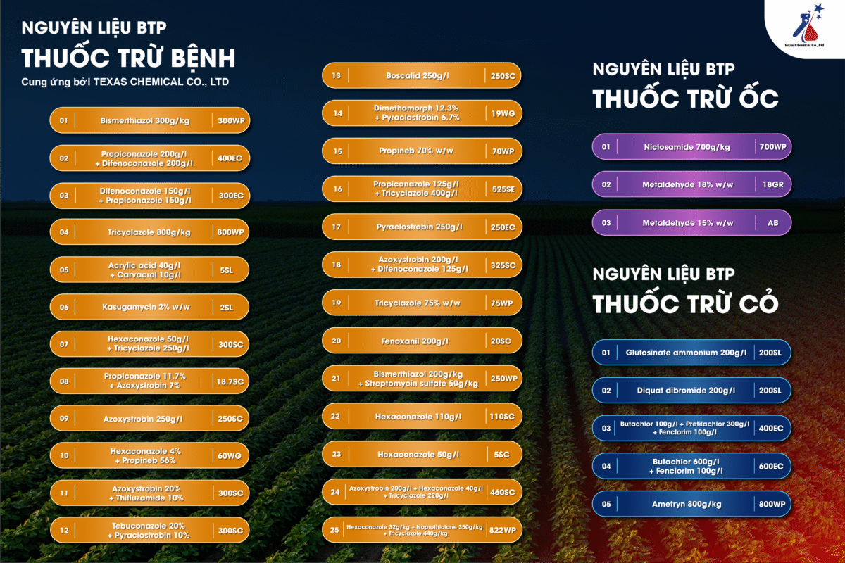Chúng tôi chuyên nhập khẩu, cung ứng nguyên liệu thuốc bảo vệ thực vật và phân bón đa dạng, chất lượng cao, nguồn gốc rõ ràng từ nhà sản xuất uy tín toàn cầu. Với quy trình chuyên nghiệp, mạng lưới đối tác rộng, TEXAS CHEMICAL cam kết nguồn nguyên liệu ổn định, giá cạnh tranh, đáp ứng mọi nhu cầu sản xuất.